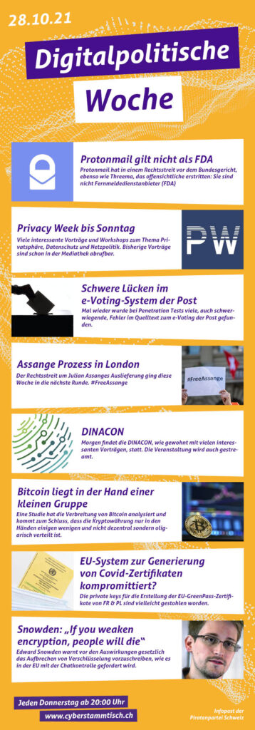 Protonmail https://steigerlegal.ch/2021/10/23/urteil-protonmail-buepf-aakd-fda/ Berichte: https://www.netzwoche.ch/news/2021-10-26/protonmail-gewinnt-einen-rechtsstreit-gegen-den-uepf https://www.inside-channels.ch/de/post/bundesverwaltungsgericht-e-mail-provider-muessen-keine-vorratsdaten-speichern-20211026 PrivacyWeek https://privacyweek.at/ https://streaming.media.ccc.de/pw21/relive eVoting Sicherheitslücken https://www.inside-it.ch/de/post/diese-schweren-luecken-habe...